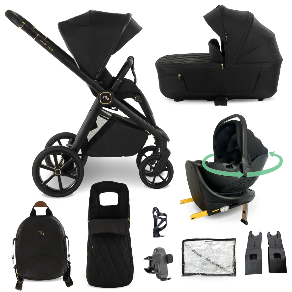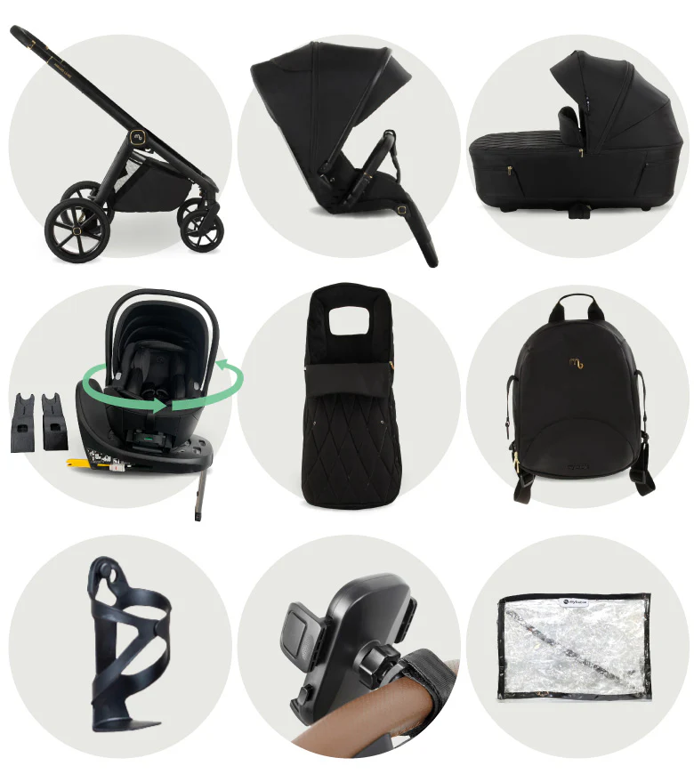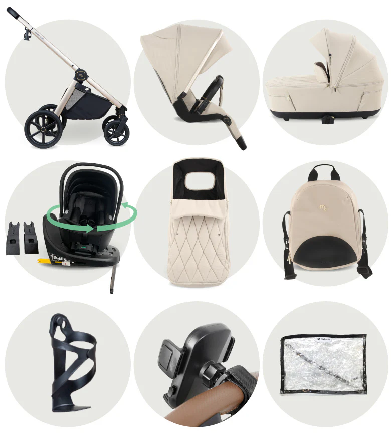 • Raincover, premium footmuff, matching bag and cup holder included