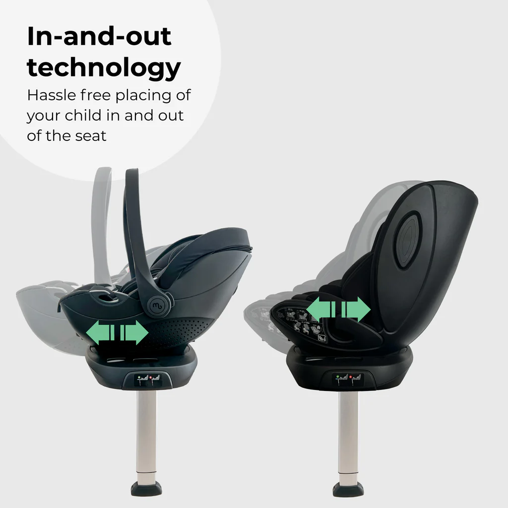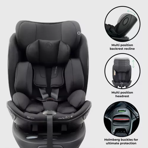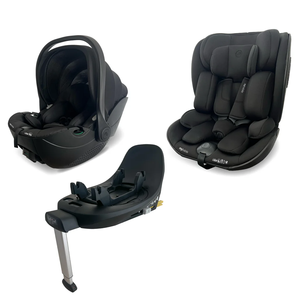 The My Babiie Family Car Seat Set grows with your child from birth to ~12 years, including an ISOFIX base, i-Size infant carrier (40–87cm), and 360° toddler seat (40–150cm).