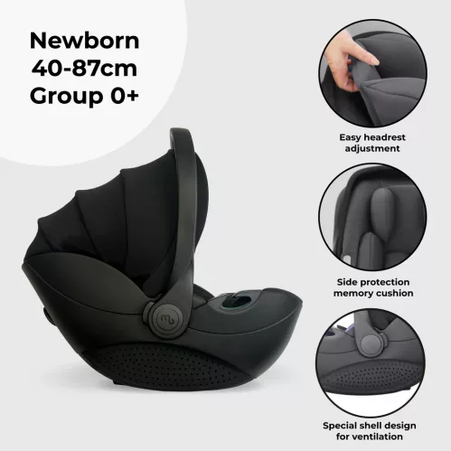 The infant carrier meets ECE R129 i-Size standards, with a newborn inlay, ventilated shell, and slide-in/out design for easy use.